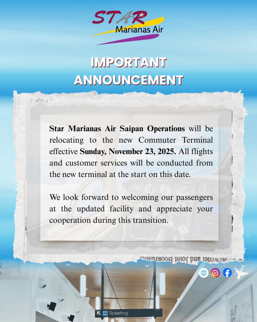SAIPANI — Star Marianas Air has announced that its Saipan operations will move to the new Commuter Terminal effective Sunday, November 23, 2025, and is advising passengers that all flights and customer services will be handled from the new facility starting that day.