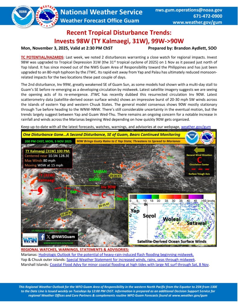 Heads up, Guam & CNMI: TY 31W is leaving, but Invest 90W is trying to spin up. Likely stationary thru Tue, then WNW–NNW with a Wed–Thu window between Yap & Guam. Expect rain/wind to tick up starting Wed.