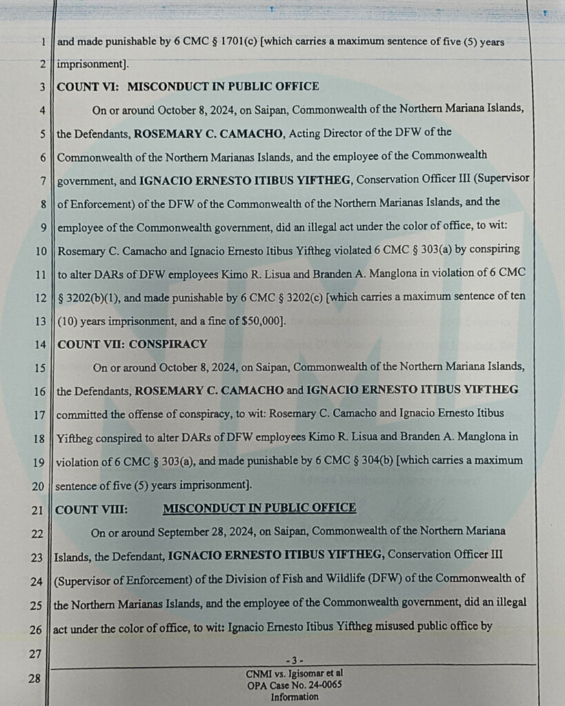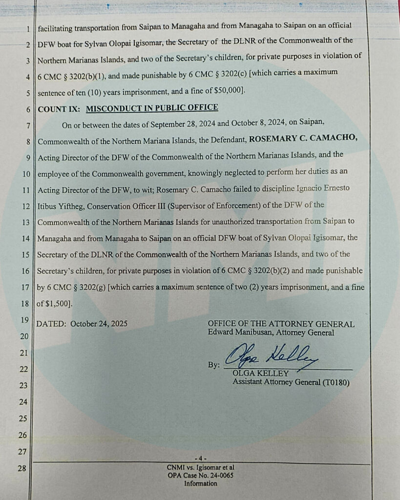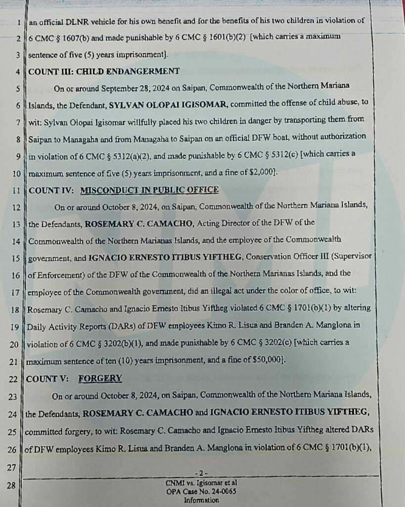 The CNMI Office of the Attorney General filed nine criminal counts on Oct. 24 against Igisomar, Camacho, and Yiftheg. Prosecutors allege that on Sept. 28, 2024, Igisomar used an official Division of Fish and Wildlife law enforcement boat and an official DLNR vehicle to transport himself and two of his children between Saipan and Managaha for private purposes. Igisomar is charged with misconduct in public office, theft of services, and child endangerment.