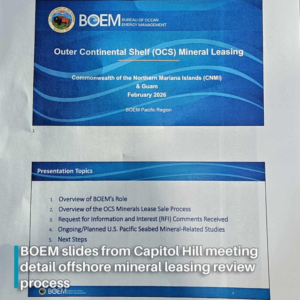 Saipan — Presentation slides shared during this week’s meeting between federal officials and local environmental professionals provide a clearer look at how the Bureau of Ocean Energy Management is approaching the early stages of a possible offshore mineral leasing review affecting waters tied to the CNMI and Guam.