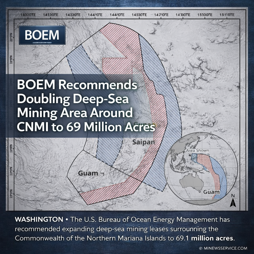 WASHINGTON — The U.S. Bureau of Ocean Energy Management has recommended moving forward with deep-sea mining leases covering approximately 69.1 million acres of ocean surrounding the Commonwealth of the Northern Mariana Islands, nearly double the area originally proposed in November 2025.