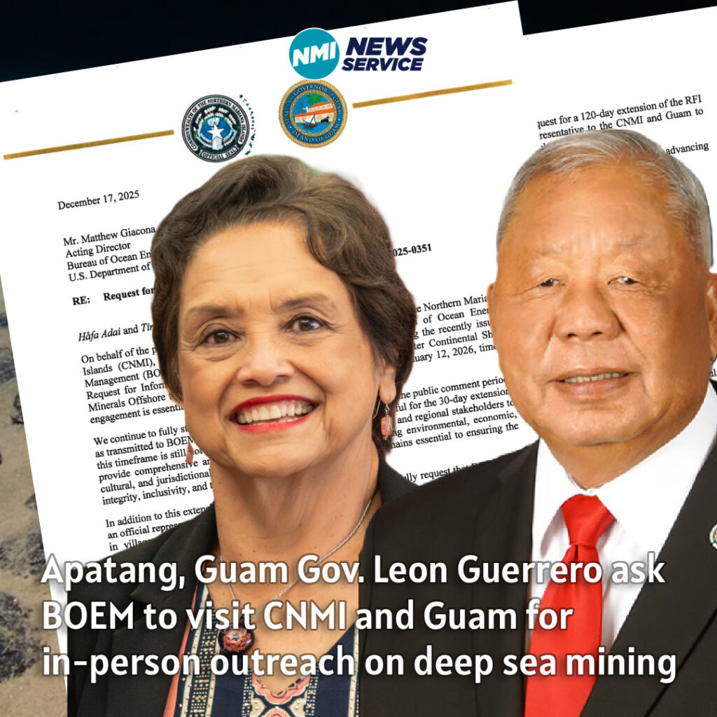 SAIPAN — Governor David M. Apatang and Guam Governor Lourdes A. Leon Guerrero sent a joint letter to Bureau of Ocean Energy Management Acting Director Matthew Giacona requesting an in-person BOEM outreach visit to both the CNMI and Guam regarding docket BOEM-2025-0351.