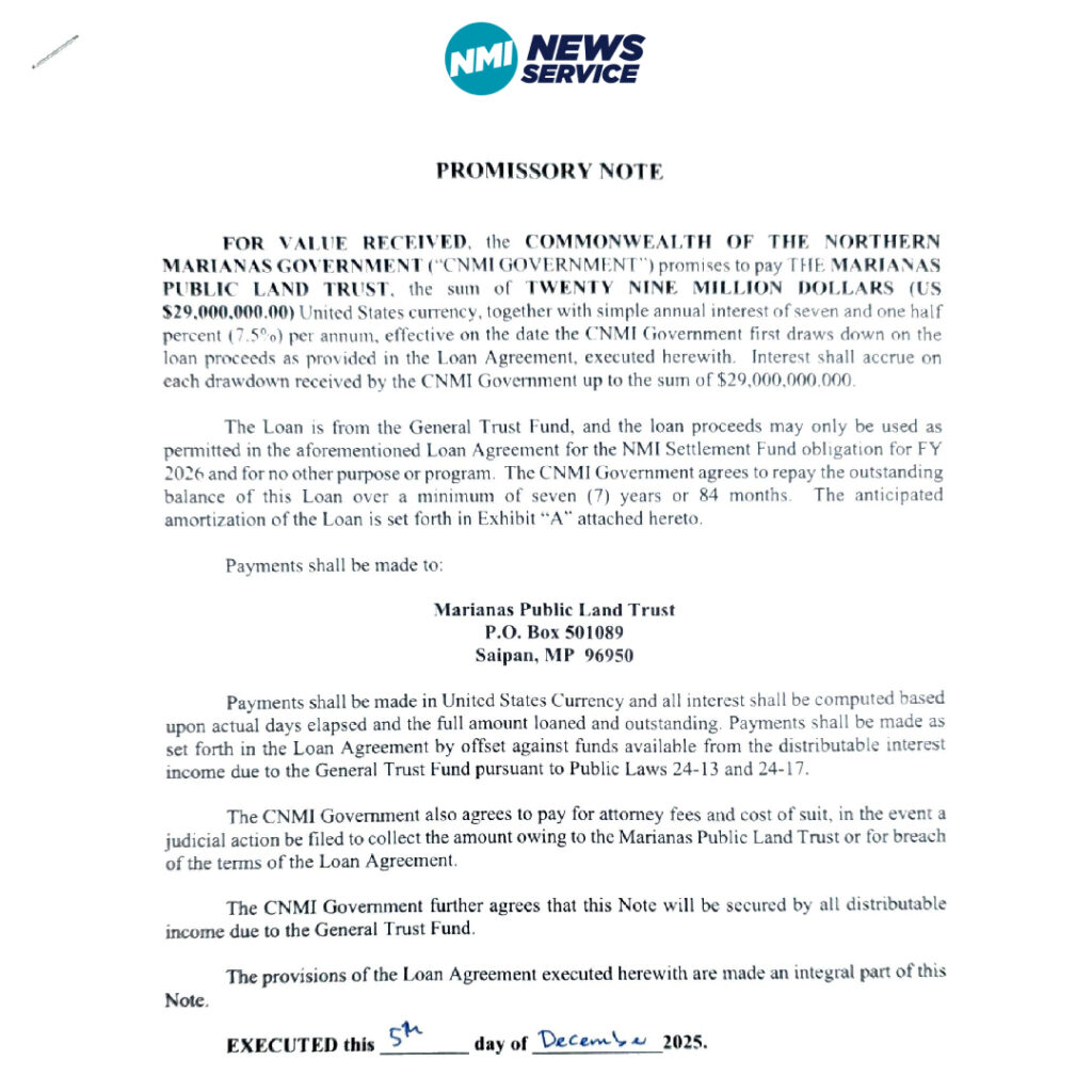 SAIPAN — The Commonwealth of the Northern Mariana Islands government has executed a $29,000,000 promissory note in favor of the Marianas Public Land Trust (MPLT), with the note setting simple annual interest of 7.5% and a minimum repayment period of seven years (84 months), based on the signed document provided to NMI News Service.