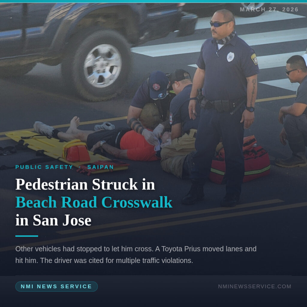 SAIPAN — A 69-year-old male pedestrian was struck by a vehicle while crossing Beach Road in San Jose at the CEDA building crosswalk on Friday, March 27, and was transported to the CHCC Emergency Room, where he was listed in stable condition.