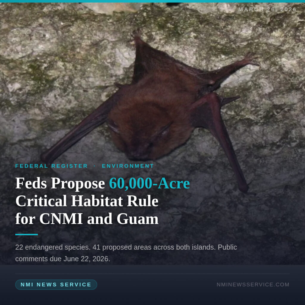 SAIPAN — The U.S. Fish and Wildlife Service has proposed designating nearly 60,000 acres across the Commonwealth of the Northern Mariana Islands and Guam as critical habitat for 22 endangered and threatened species, a move that could affect how federally funded and federally permitted projects are reviewed across both jurisdictions.