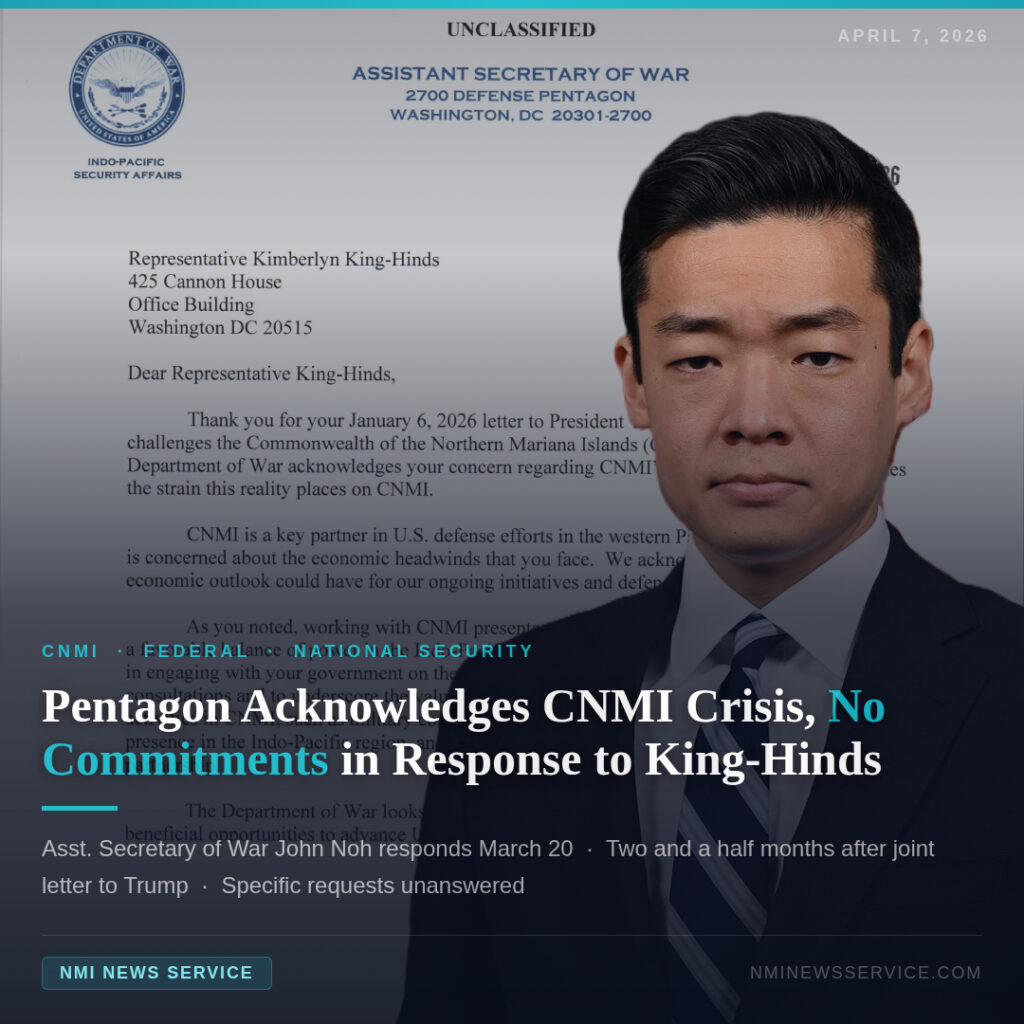 SAIPAN — The assistant secretary of war for Indo-Pacific security affairs has responded to Congresswoman Kimberlyn King-Hinds’ January letter urging federal action on the CNMI’s economic crisis, acknowledging the Commonwealth’s fiscal strain and its strategic value to the United States but stopping short of any specific commitments.
