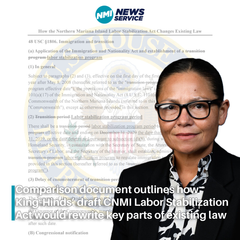 WASHINGTON, D.C. — A new comparison document circulated with CNMI Delegate Kimberlyn King-Hinds’ draft Northern Mariana Islands Labor Stabilization Act lays out how the proposal would change existing federal law governing the CNMI’s immigration transition program, including extending the program timeline and creating a new process for possible future extensions.