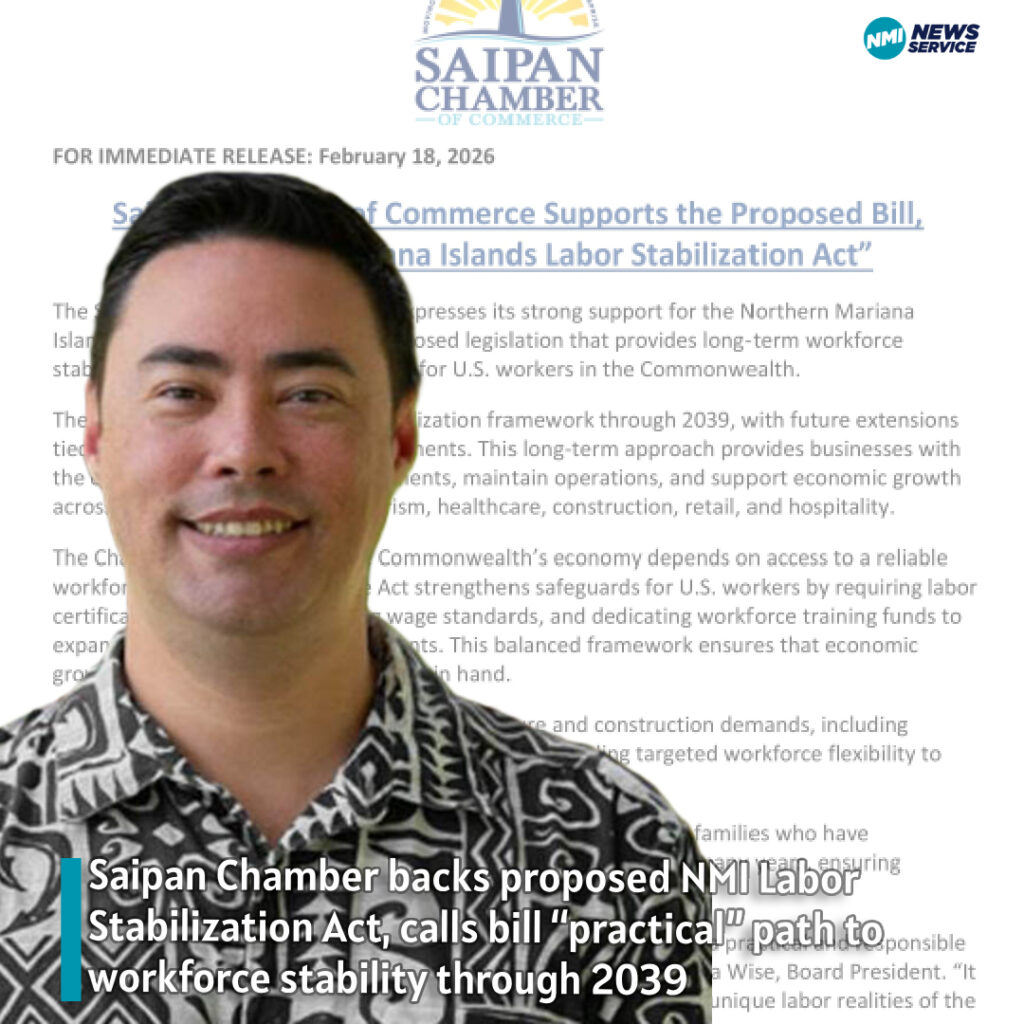 SAIPAN — The Saipan Chamber of Commerce is backing the proposed “Northern Mariana Islands Labor Stabilization Act,” saying the measure would provide long-term workforce stability for businesses while reinforcing protections for U.S. workers in the Commonwealth.