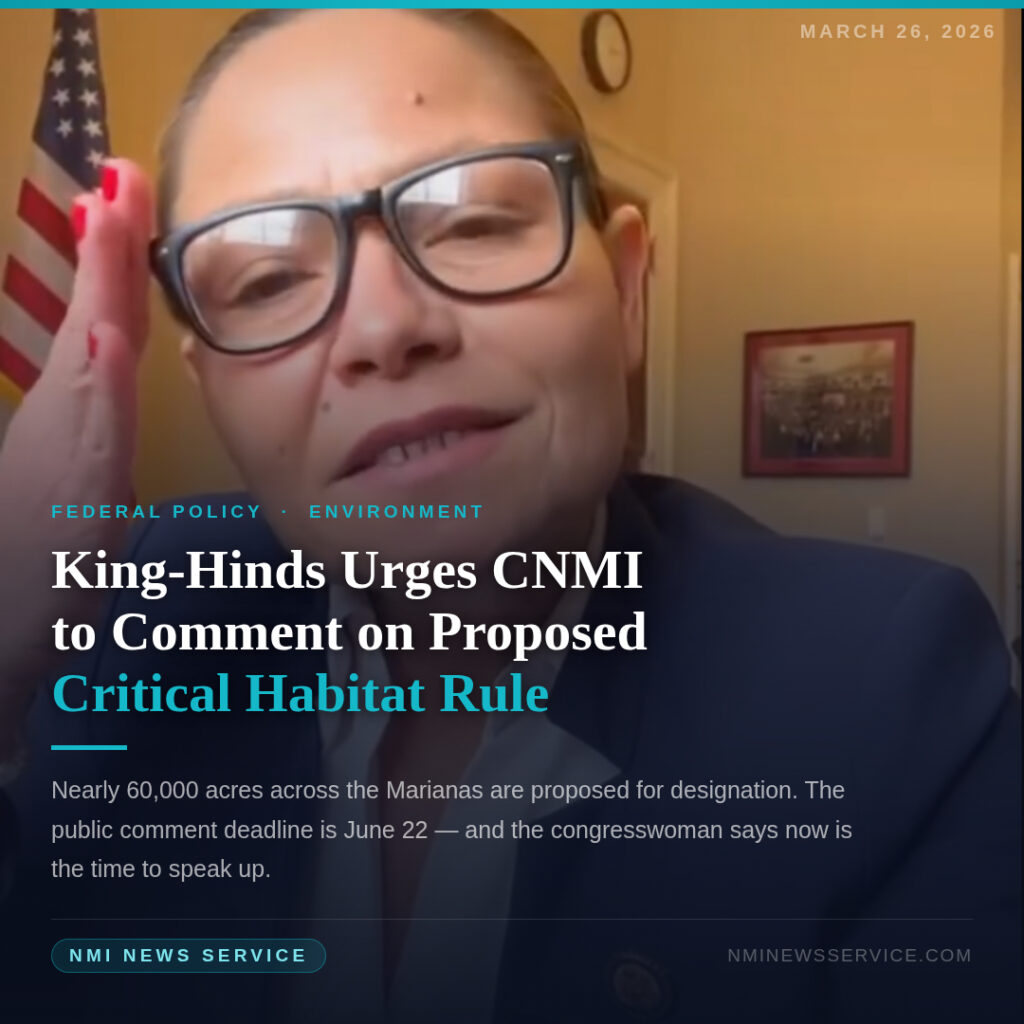 SAIPAN — Congresswoman Kimberlyn King-Hinds is calling on CNMI residents, landowners and businesses to submit public comments on a sweeping proposed federal rule that would designate nearly 60,000 acres of critical habitat for 22 endangered and threatened species across the Marianas, warning that the designation could affect the timeline and cost of federally funded projects on local and private lands.