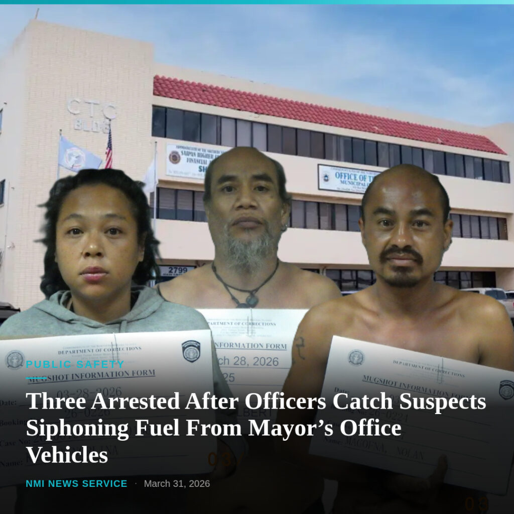 SAIPAN — Three people were arrested early Saturday after a patrol officer observed them acting suspiciously near government vehicles parked at the Mayor’s Office, leading to the discovery of siphoned fuel and methamphetamine, the Department of Public Safety said.