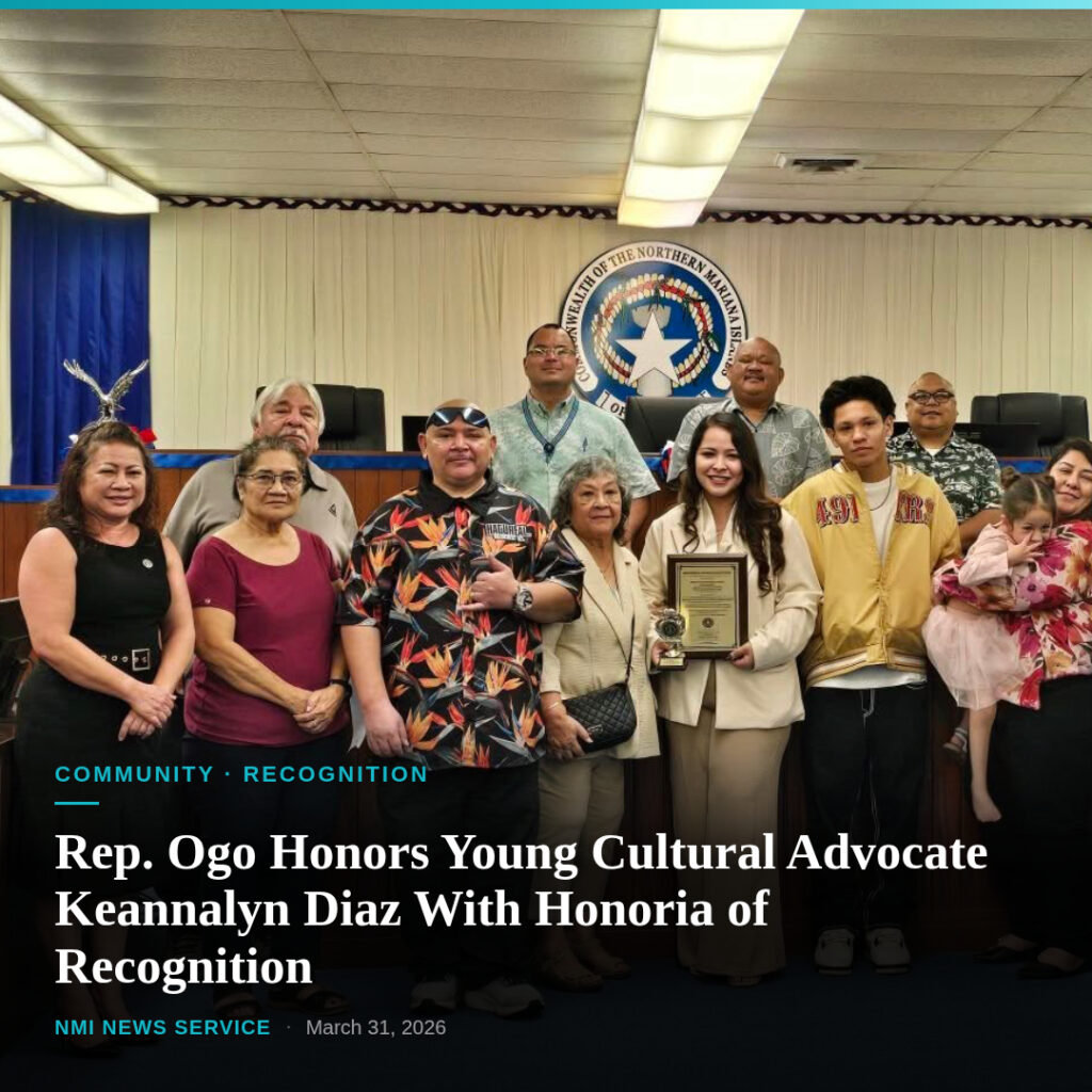 SAIPAN — The Office of Representative Julie Marie A. Ogo has presented a Honoria of Recognition to Keannalyn Chanel Angel Diaz in recognition of her work promoting Chamorro and Carolinian culture and her commitment to pursuing higher education.