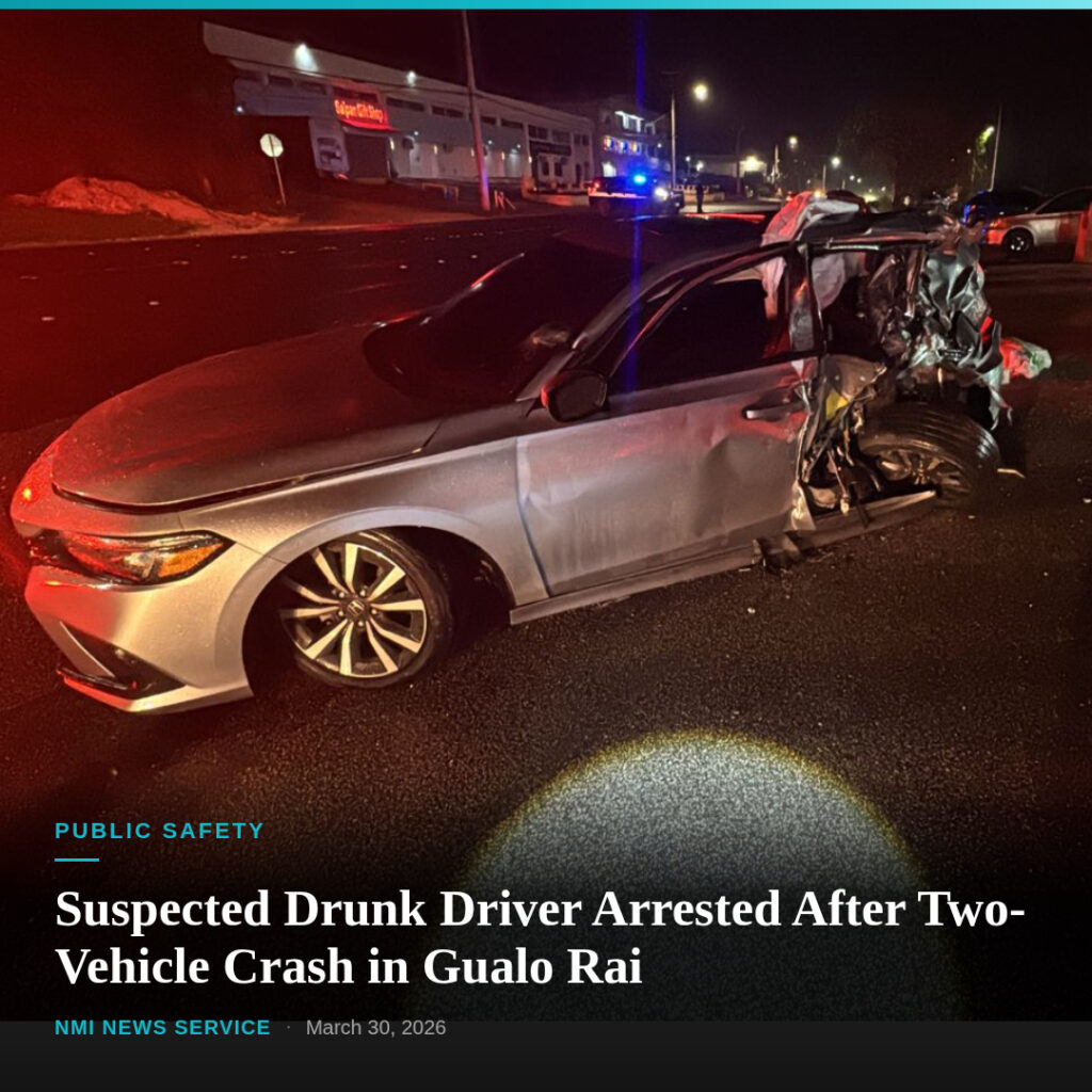 SAIPAN — A 26-year-old man was arrested on suspicion of driving under the influence after a two-vehicle crash on Chalan Pale Arnold Road in Gualo Rai left four people injured and debris scattered across all four lanes of the roadway, the Department of Public Safety said.