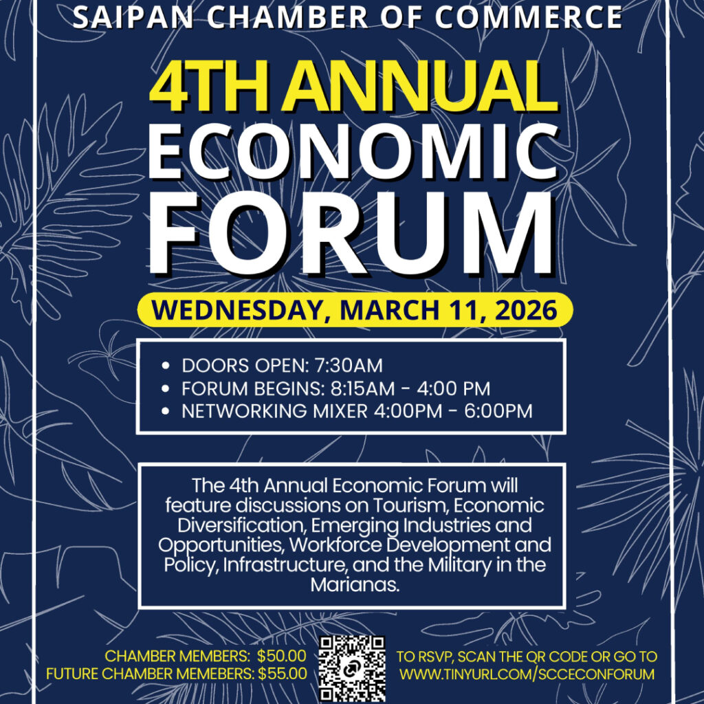 SAIPAN — The Saipan Chamber of Commerce is moving ahead with its 4th Annual Economic Forum on Wednesday, March 11, at Kensington Hall at the Kensington Hotel Saipan, with Chamber leaders calling the event a key venue for business, government and community stakeholders to discuss the Commonwealth’s economic direction.