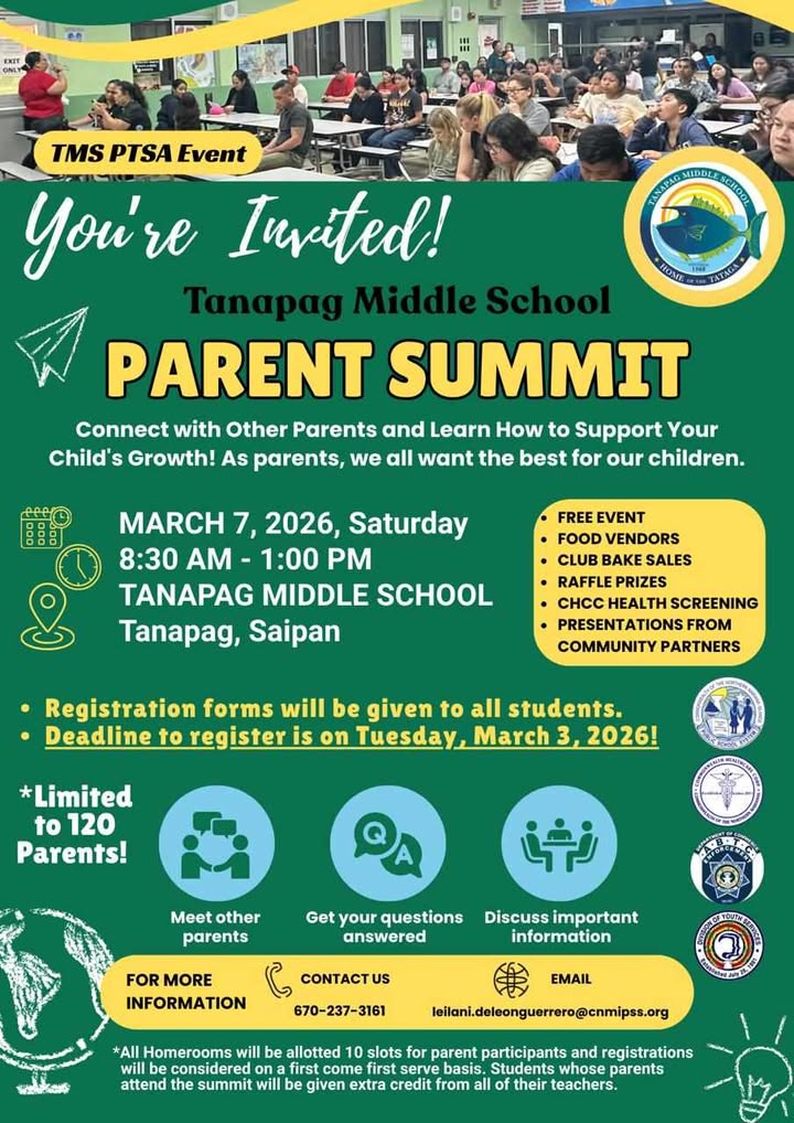 SAIPAN — Tanapag Middle School’s PTSA is hosting a Parent Summit this Saturday, March 7, from 8:30 a.m. to 1:00 p.m. at the school in Tanapag.