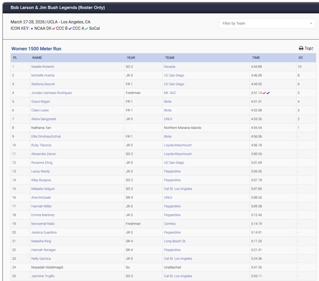 The top finisher was Natalie Roberts of Nevada, who won in 4:44.89. Michelle Huerta of UC San Diego was second in 4:46.09.