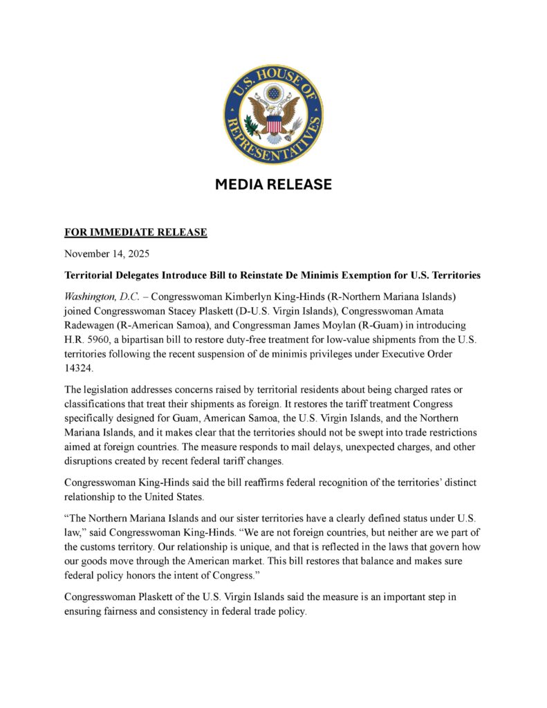 WASHINGTON —Congresswoman Kimberlyn King-Hinds has joined delegates from Guam, American Samoa and the U.S. Virgin Islands to introduce H.R. 5960, a bipartisan bill to restore duty-free treatment for low-value shipments from the U.S. territories after the recent suspension of de minimis privileges under Executive Order 14324.