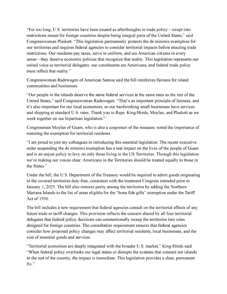 “For too long, U.S. territories have been treated as afterthoughts in trade policy—swept into restrictions meant for foreign countries despite being integral parts of the United States,” she said, adding that the legislation “permanently protects the de minimis exemption for our territories and requires federal agencies to consider territorial impacts before enacting trade restrictions.”