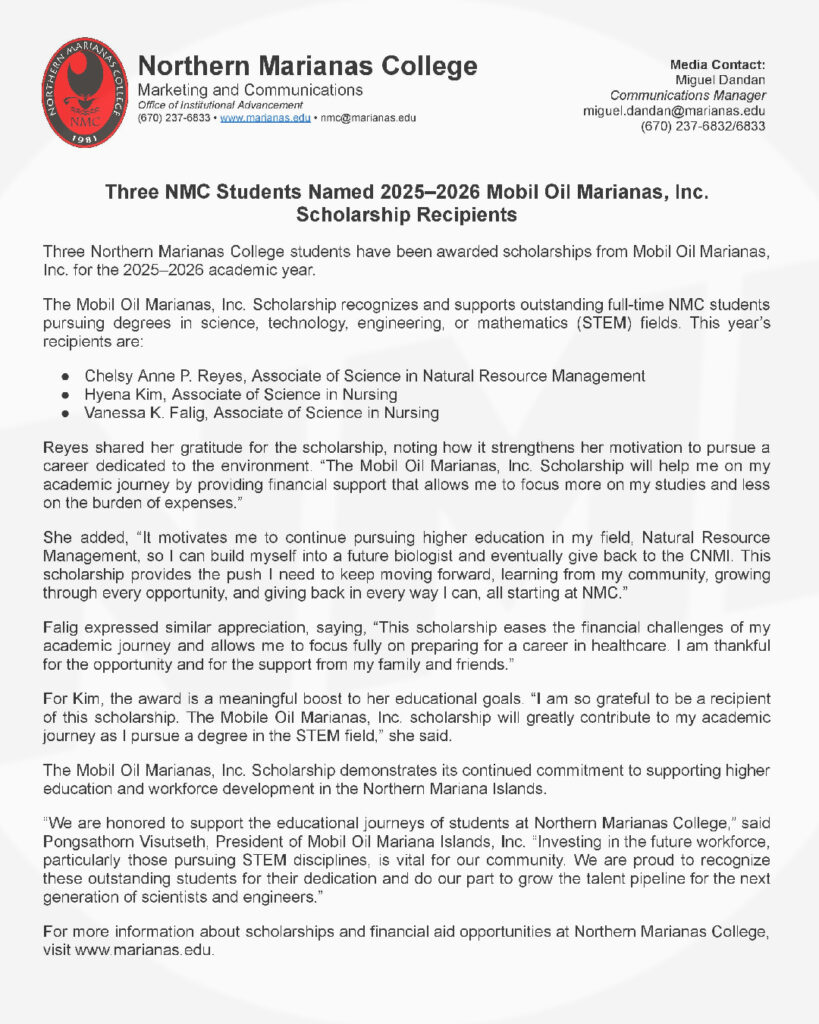 The Mobil Oil Marianas, Inc. Scholarship recognizes and supports outstanding full-time NMC students pursuing degrees in science, technology, engineering, or mathematics fields. Reyes said the award will help her focus more on her studies and pursue a future career dedicated to the environment, while Falig said it will ease financial challenges and allow her to focus on preparing for a healthcare career. Kim said the scholarship will “greatly contribute” to her academic journey in a STEM field.
