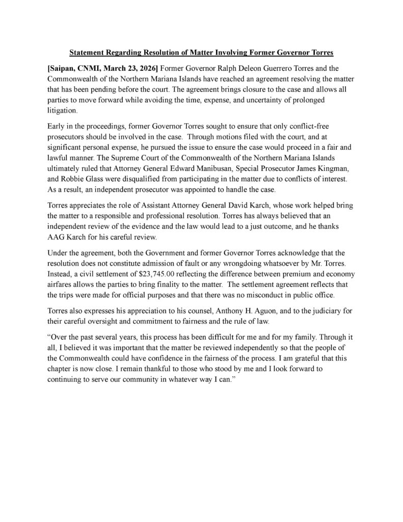 [Saipan, CNMI, March 23, 2026] Former Governor Ralph Deleon Guerrero Torres and the Commonwealth of the Northern Mariana Islands have reached an agreement resolving the matter that has been pending before the court. The agreement brings closure to the case and allows all parties to move forward while avoiding the time, expense, and uncertainty of prolonged litigation.