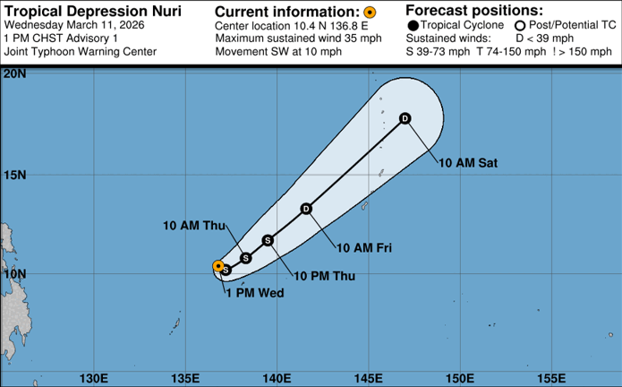SAIPAN — The system forecasters had been tracking as Invest 95W has been upgraded to Tropical Depression Nuri, the third tropical cyclone of the western North Pacific season, and is now forecast to turn northeastward toward the Mariana Islands with a possible passage through the northern CNMI early Saturday.