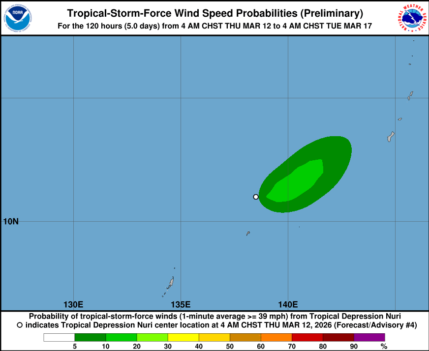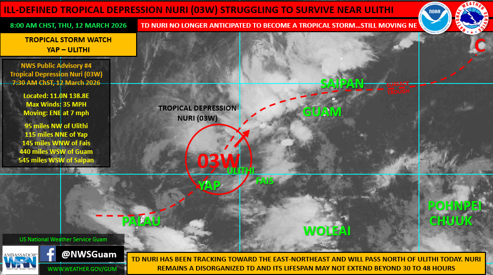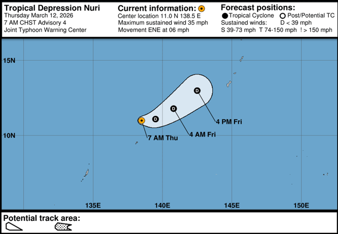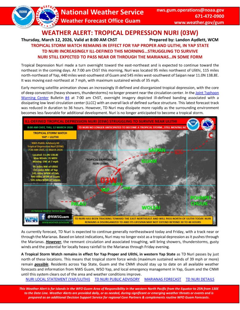 NWS Guam said Nuri may dissipate more rapidly than forecast as the surrounding environment becomes less favorable for development. However, even if the system falls apart before reaching the islands, its remnant circulation and associated troughing are still expected to produce showers, thunderstorms, gusty winds and the potential for locally heavy rainfall across the Marianas through Friday evening.