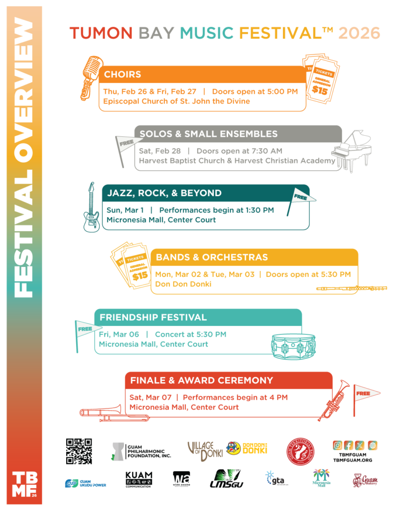 According to organizers, the schedule includes the Choral Festival on February 26 and 27 at the Episcopal Church of St. John the Divine, the Solo and Small Ensemble Festival on February 28 at Harvest Baptist Church and Harvest Christian Academy, “Jazz, Rock, & Beyond” on March 1 at Micronesia Mall Center Court, the Bands and Orchestras Festival on March 2 and 3 at Don Don Donki lower level, the School Band Friendship Festival on March 6 at Micronesia Mall Center Court, and the Finale and Award Ceremony on March 7 at Micronesia Mall Center Court.