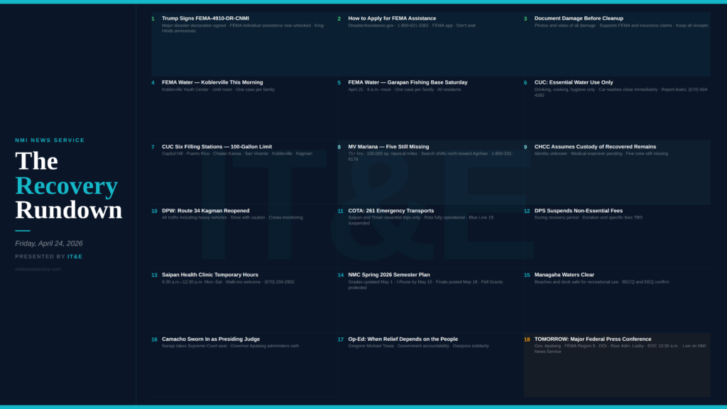 Recovery Day 10 begins with a major federal press conference at the Emergency Operations Center on Capitol Hill at 10:30 a.m. Saturday. Governor David M. Apatang will be joined by FEMA Region 9 Administrator Robert Fenton, U.S. Department of the Interior officials and Rear Admiral Joshua Lasky, Commander of Joint Task Force Micronesia. NMI News Service will carry it live on Facebook and YouTube.